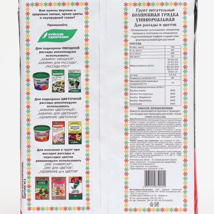 Грунт для выращивания рассады овощных и цветочных культур, декоративных горшечных растений и выгонки зеленных культур. Приготовлен на основе нейтрализованного верхового торфа с добавлением в сбалансированном соотношении необходимых макро- и микроэлементов.