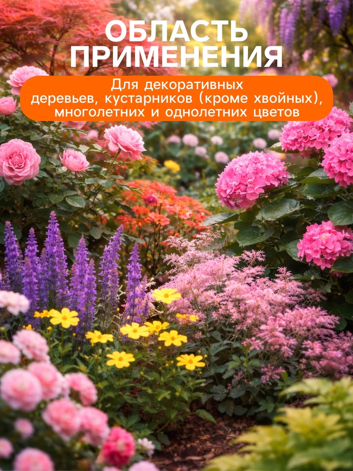 * Универсальное средство для цветника: подходит для однолетних и многолетних цветов, роз, пионов, гортензий, а также декоративных кустарников — сирени, спиреи, барбариса. Одно решение для большинства растений в саду и дома.