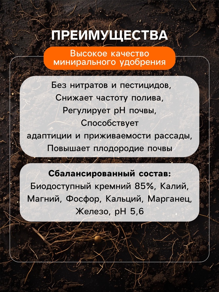 * Сбалансированный комплекс NPK: состав содержит биодоступный кремний (SiO2) - 85%, калий, магний фосфор, кальций, марганец, железо pH 5,6 в оптимальной пропорции. Это поддерживает развитие корневой системы, наращивание зеленой массы и общее укрепление растения.
