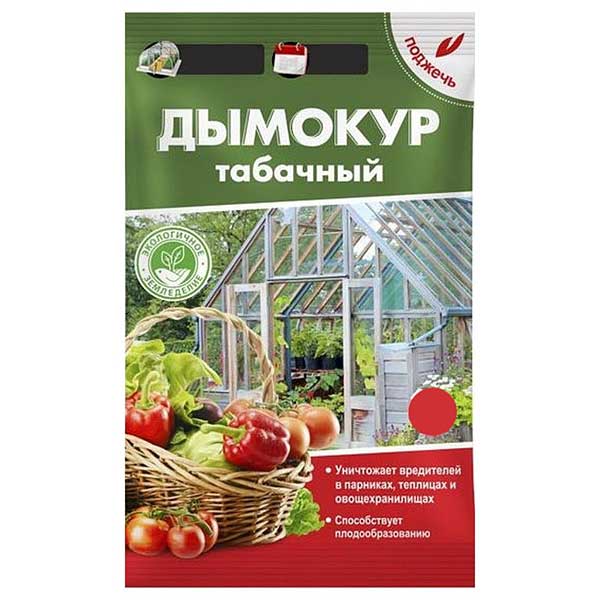 Шашка Дымокур табачный применяется для обработки теплиц, парников, оранжерей в период вегетации от насекомых-вредителей. Выделяемый дым оказывает благотворное влияние на рост и развитие растений за счет высокого содержания углекислого газа, необходимого растениям для фотосинтеза. После окуривания заметно увеличивается зеленая масса, растения меньше подвержены всевозможным заболеваниям, сокращается период созревания плодов.