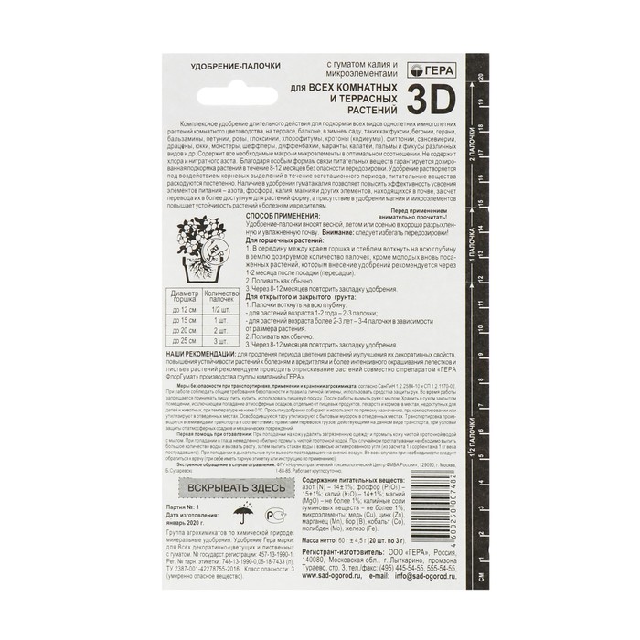 Удобрение «Гера 3D» для всех комнатных и террасных растений с гуматом калия, палочки, 60 г