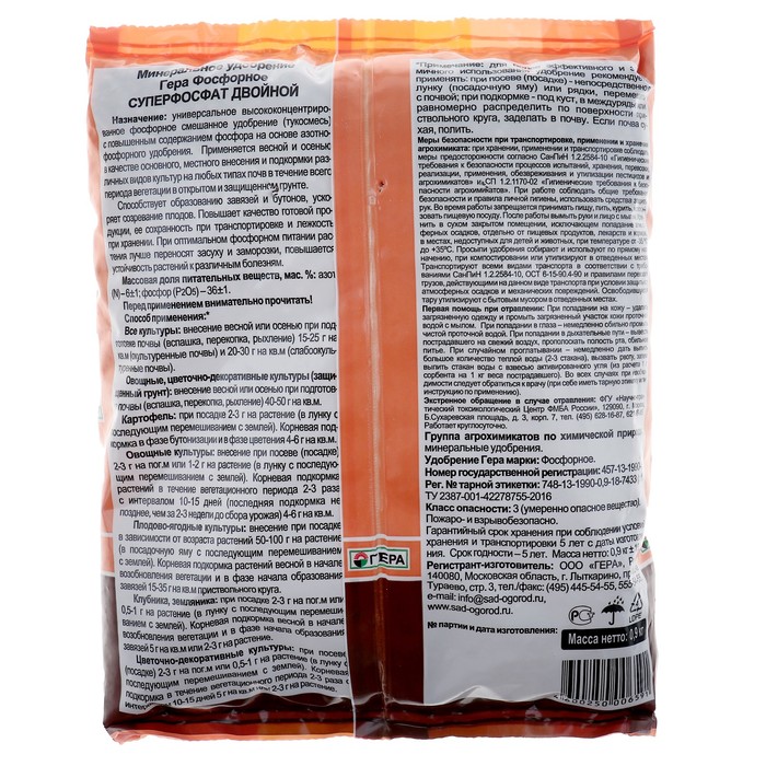 Удобрение "ГЕРА" Суперфосфат двойной, Фосфорное, 900 г