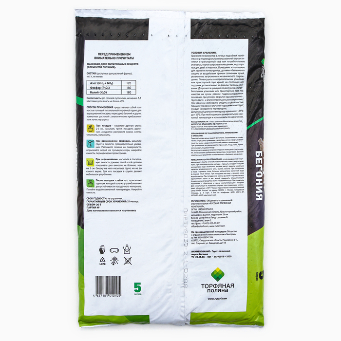 Грунт почвенный Бегония "Торфяная поляна", 5л