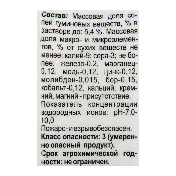 Состав: Массовая доля солей гуминовых веществ, % в растворе до: 5,4%. Массовая доля макро- и микроэлементов, % от сухих веществ не менее: калий-9, сера-3, не более: железо-0,2, марганец-0,12, медь-0,12, цинк-0,12,молибден-0,015, бор-0,15, кобальт-0,12, селен-0,005, азот, фосфор, кальций, кремний, магний - присутствие. Показатель концентрации водородных ионов: рН6%: 7,0-10,0.