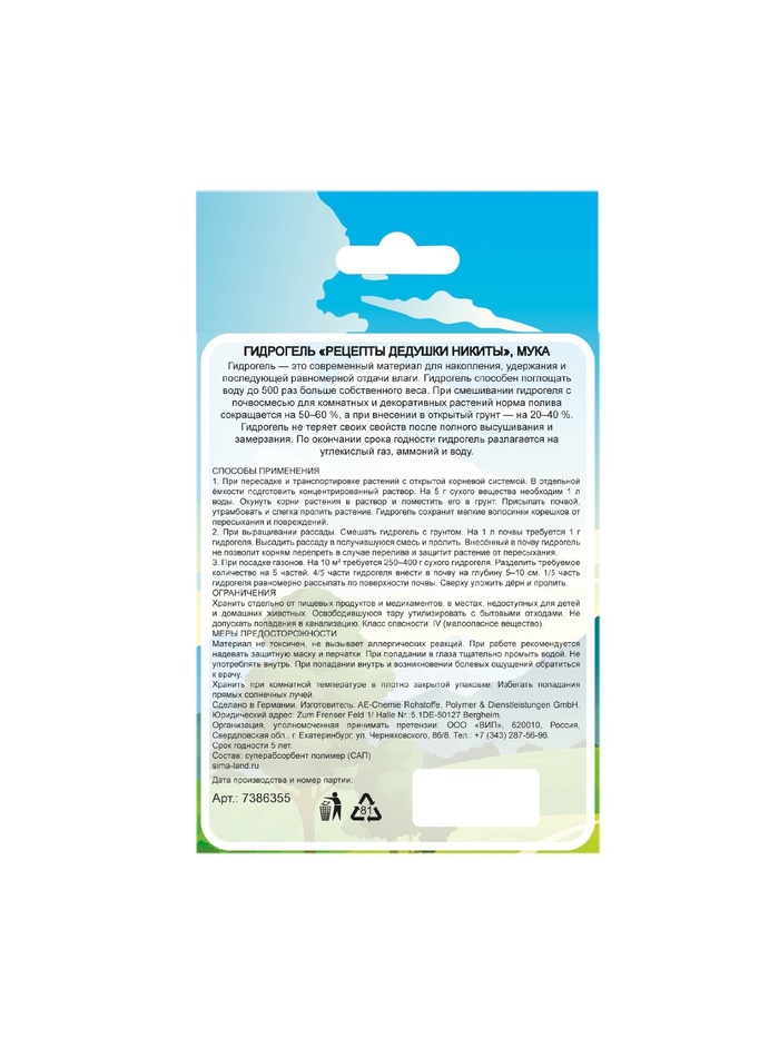 Гидрогель «Рецепты Дедушки Никиты», мука, 100 г