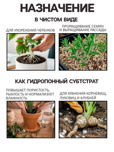 1. Составной компонент грунта. При составлении субстрата для большинства растений 12% от объема грунта, кактусов и суккулентов 1-2 части на 1 часть грунта, для крупномерных растений 45% от общего объема грунта.