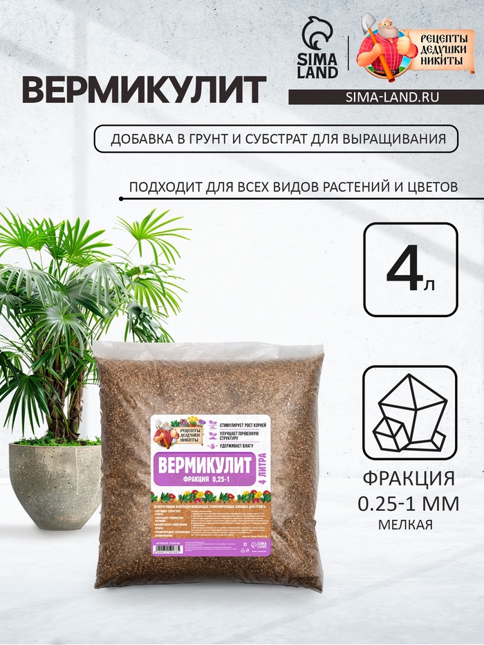 Вермикулит «Рецепты Дедушки Никиты» для растений, добавка в грунт, для рассады, фр 0.25-1, 4 л.
