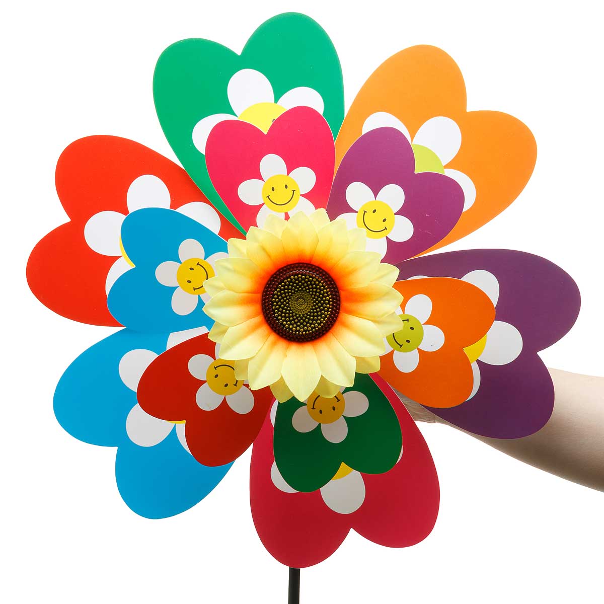 Ветряк D-35см. ПОДСОЛНУХ NA2576 двойной, цветные лепестки со смайликами, высота 55см (150)