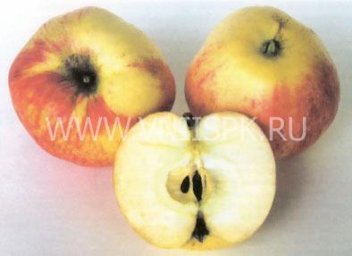 Плоды (рис.) вышесредней величины, уплощенно-округлые, со слабо выраженной ребристостью, поверхность гладкая, основная окраска желтая, покровная – в виде ярко-красных штрихов по размытому фону на большей части плода. Подкожные точки беловатые, многочисленные. Плодоножка средней длины, толстая. Воронка мелкая, широкая, у плодоножки нежно оржавленная. Блюдце широкое, средней глубины. Чашечка полузакрытая. Подчашечная трубка коническая. Сердечко луковичное, семенные камеры закрытые, семена крупные, коричневые, плоские, широкие.