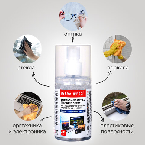 Чистящий набор для экранов всех типов и оптики BRAUBERG, комплект салфетка и спрей, 200 мл, 513560