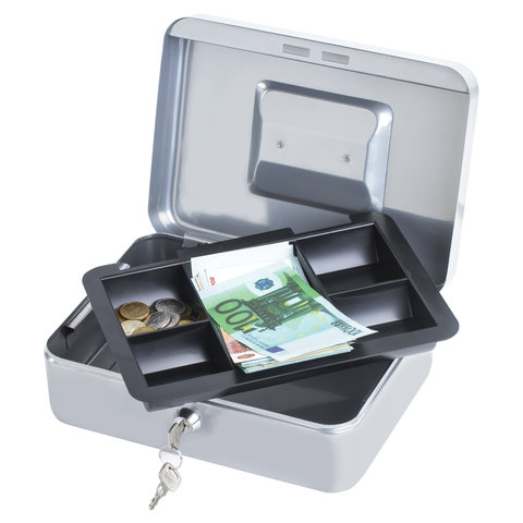 Ящик BRAUBERG предназначен для хранения и транспортировки денег, ценных вещей, документов, печатей, медикаментов. Используется дома и в офисе для ограничения доступа посторонних лиц. Отличное сочетание надёжности и вместительности. Съемный лоток из ударопрочного пластика с 3 отделениями. Подходит для денег, карточек, ключей, печатей. Под лотком есть пространство, где можно хранить документы и бумаги. Изготовлен из стали толщиной 0,8 мм. Надежный корпус с удобной ручкой выполнен в серебристом цвете. С ключевым замком, в комплекте 2 ключа. Размер - 90х180х250 мм. Накопления всегда находятся под рукой, и в случае экстренной ситуации ими можно будет беспрепятственно воспользоваться в любое время суток.