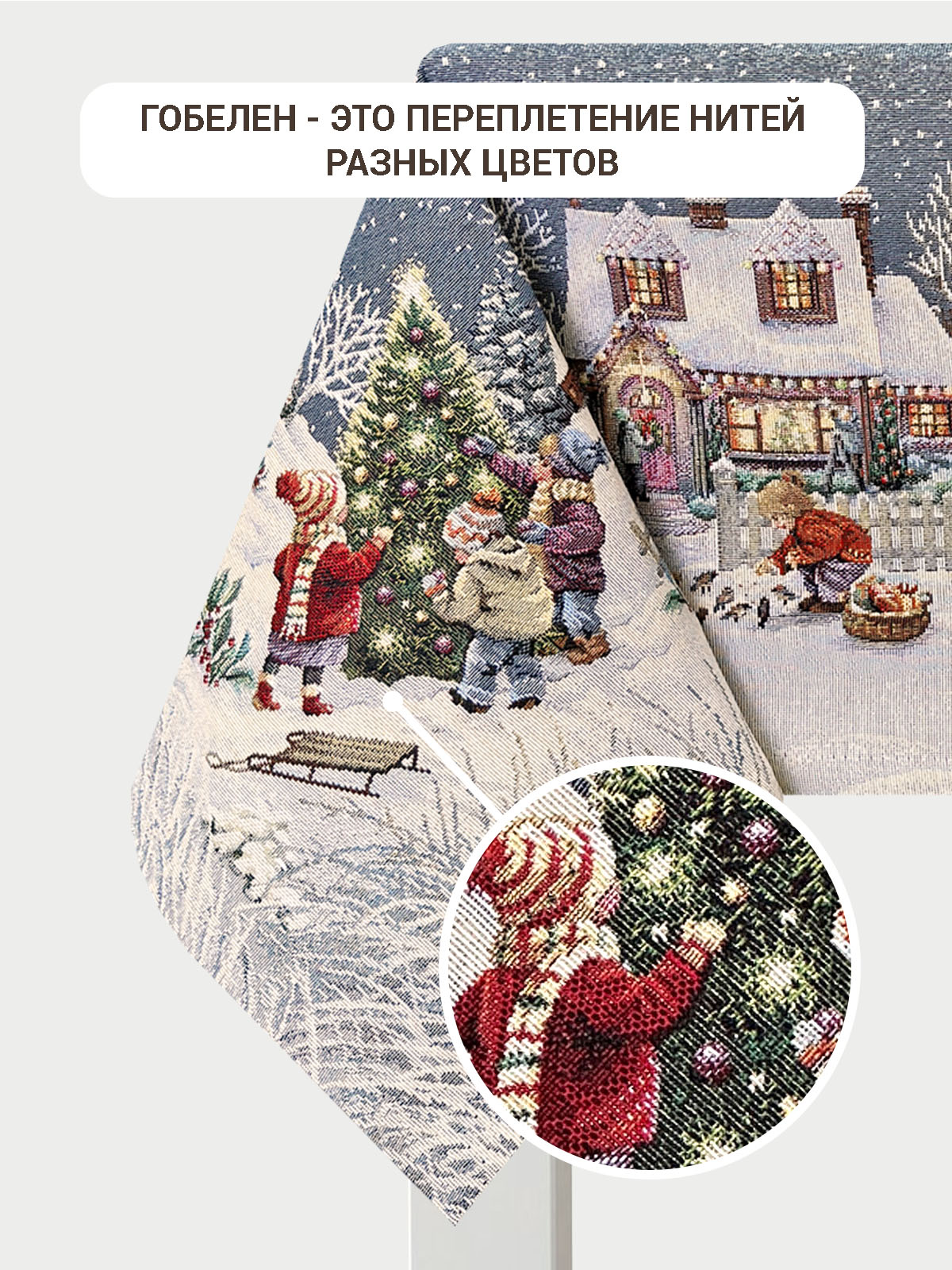 Рисунок создается переплетением нитей различных цветов и фактуры. Состав ткани: хлопок ( дающий фактуру и приятную тактильность ) и синтетические нити ( придающие износостойкость ). Плотность гобелена 410 г на кв.метр.
