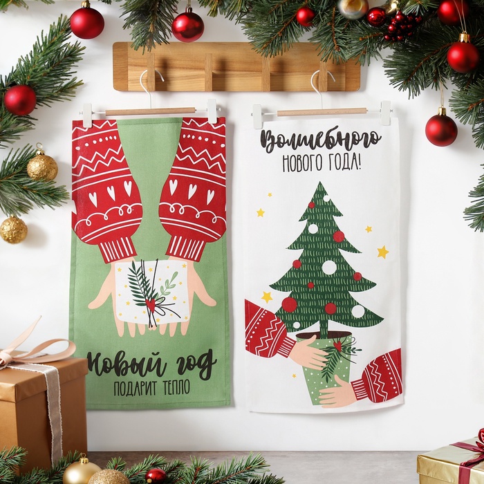 Набор новогодний кухонный новогодних полотенец Доляна «Тепло Нового года» 35×60 см-2 штуки, 100% хлопок, 160 г/м²
