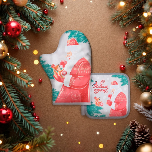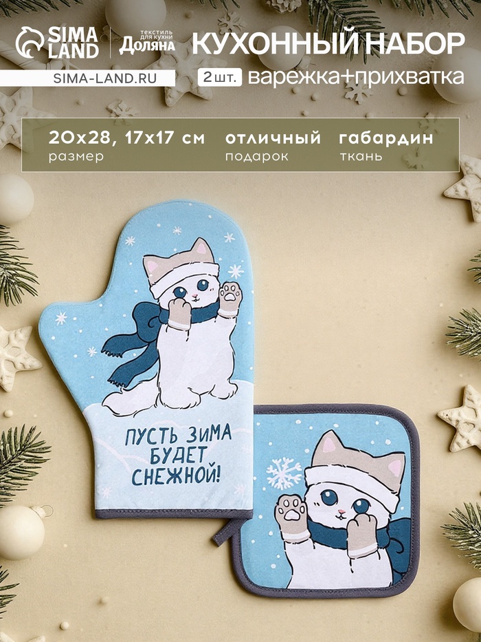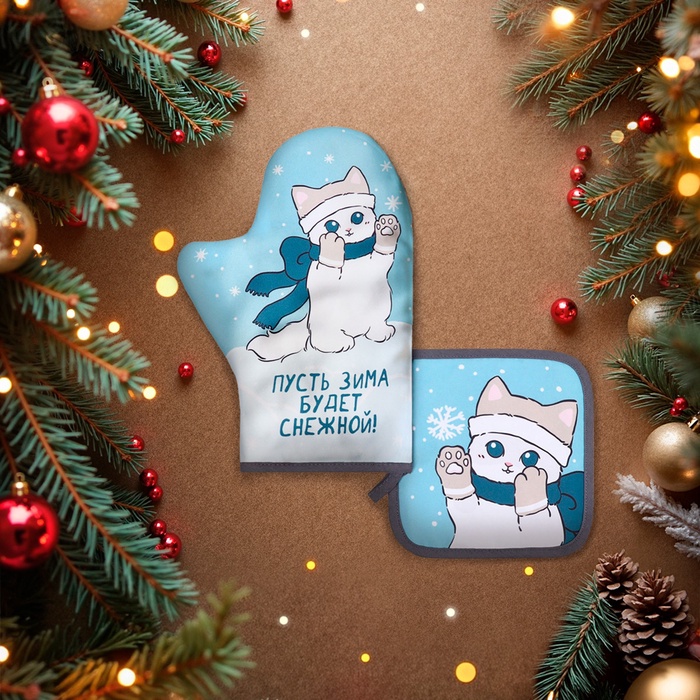 Набор кухонный «Доляна. Снежная зима»: прихватка 17×17 см, варежка-прихватка 20×28 см, 35% хлопок