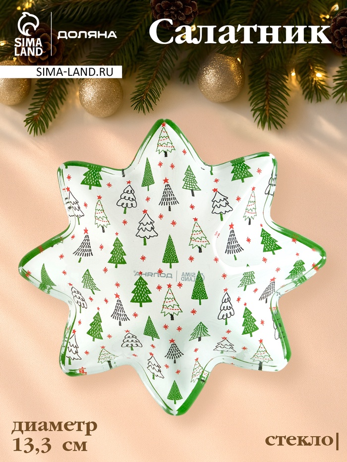 Добавьте праздничного шарма салатам! Новогодний салатник в форме звезды – стеклянная ёмкость в белом и зелёным цветах с новогодним рисунком. Она подходит для подачи салатов, овощных нарезок и закусок на праздничном столе.