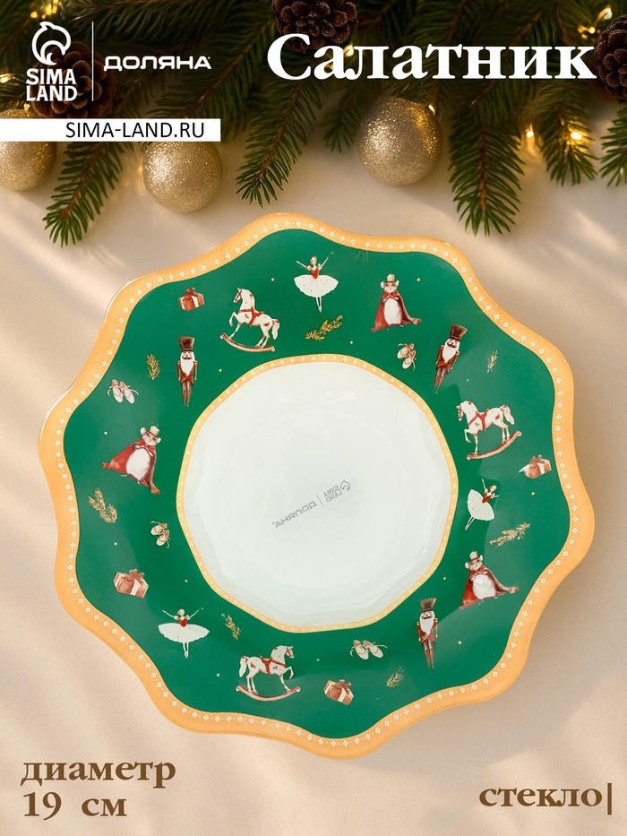 Пусть салат подают как часть праздника! Новогодний салатник — круглая стеклянная ёмкость диаметром 19 см с бело-зелёным рисунком в зимней тематике. Он идеально подойдет для подачи салатов или закусок так, чтобы гости сразу почувствовали атмосферу Нового года.
