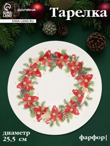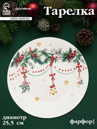 Праздничная тарелка «Зимние мотивы» станет ярким акцентом для любого новогоднего застолья. Изящный фарфор и красочный рисунок создают атмосферу уюта и радости. Напоминающие о подарках под ёлкой, декольные элементы на белом фоне словно оживают на гладкой, круглой поверхности диаметром 25,5 см.