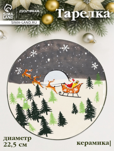 Эта праздничная тарелка с новогодним сюжетом превращает сервировку в путешествие к зимним чудесам. Диаметр 22.5 см удобен для подачи основных блюд и десертов — от рождественского гуся до имбирного печенья. Разноцветный рисунок с техникой деколь создаёт глубину изображения, где каждый элемент рассказывает часть праздничной истории.
