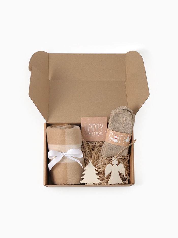 Составляющие набора: Открытка, Носки, Игрушка, Плед