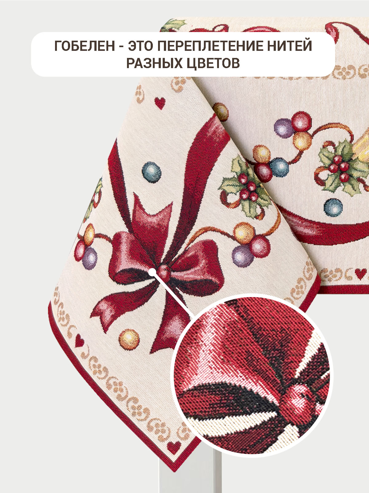 Рисунок создается переплетением нитей различных цветов и фактуры. Состав ткани: хлопок ( дающий фактуру и приятную тактильность ) и синтетические нити ( придающие износостойкость ). Плотность гобелена 410 г на кв.метр.