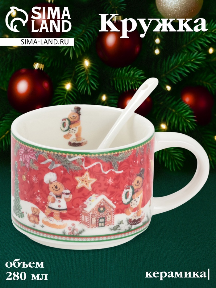 Эта новогодняя кружка с изображением пряничного домика и ложкой станет ярким акцентом праздничного настроения. Объем 280 мл и красочный декор создают уютную атмосферу для горячих напитков — чая, какао или кофе — в зимние дни.