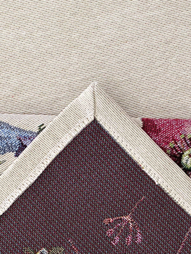 Рисунок создается переплетением нитей различных цветов и фактуры. Состав ткани: хлопок ( дающий фактуру и приятную тактильность ) и синтетические нити ( придающие износостойкость ). Плотность гобелена 410 г на кв.метр.