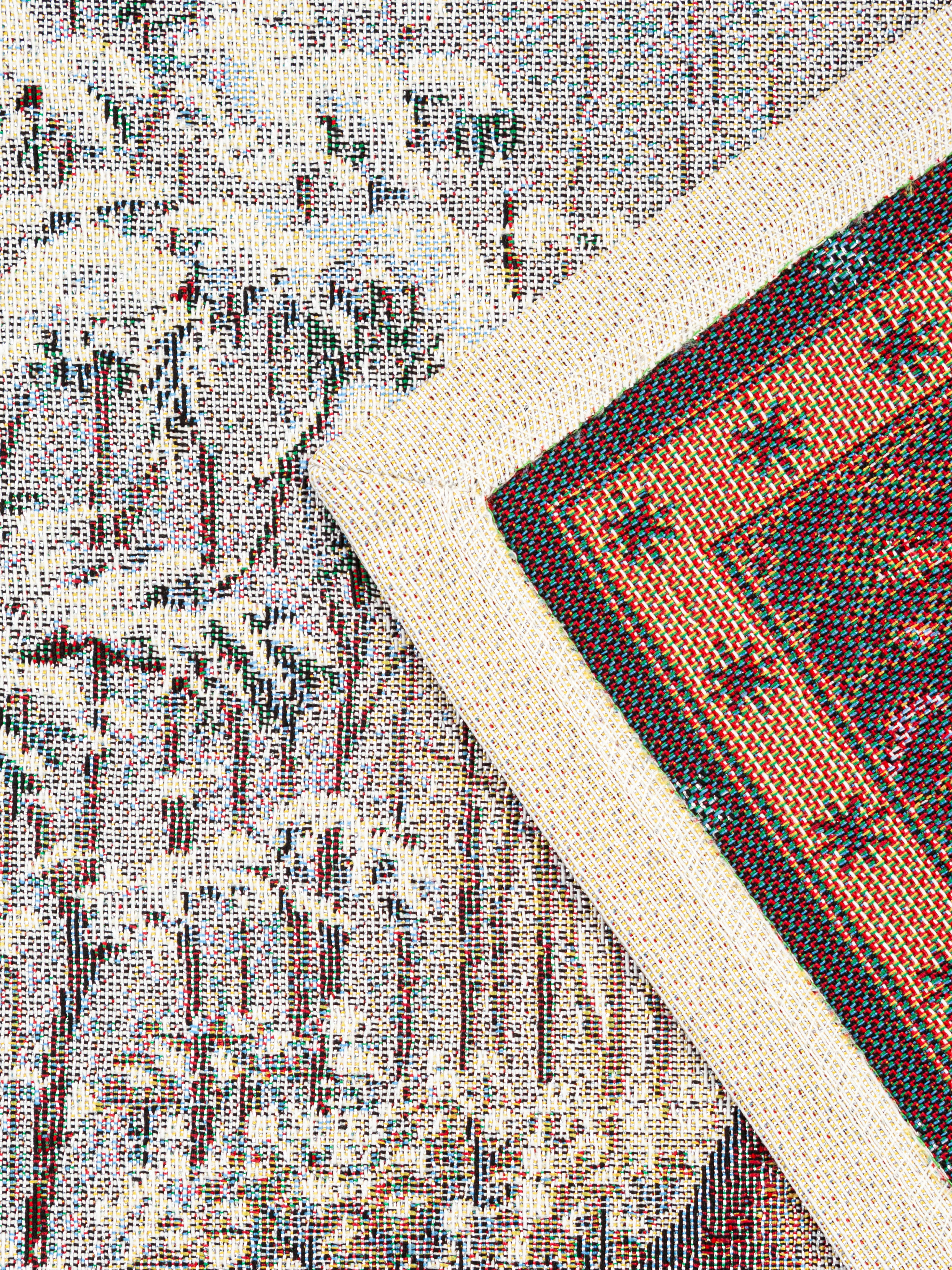 Рисунок создается переплетением нитей различных цветов и фактуры. Состав ткани: хлопок ( дающий фактуру и приятную тактильность ) и синтетические нити ( придающие износостойкость ). Плотность гобелена 410 г на кв.метр.