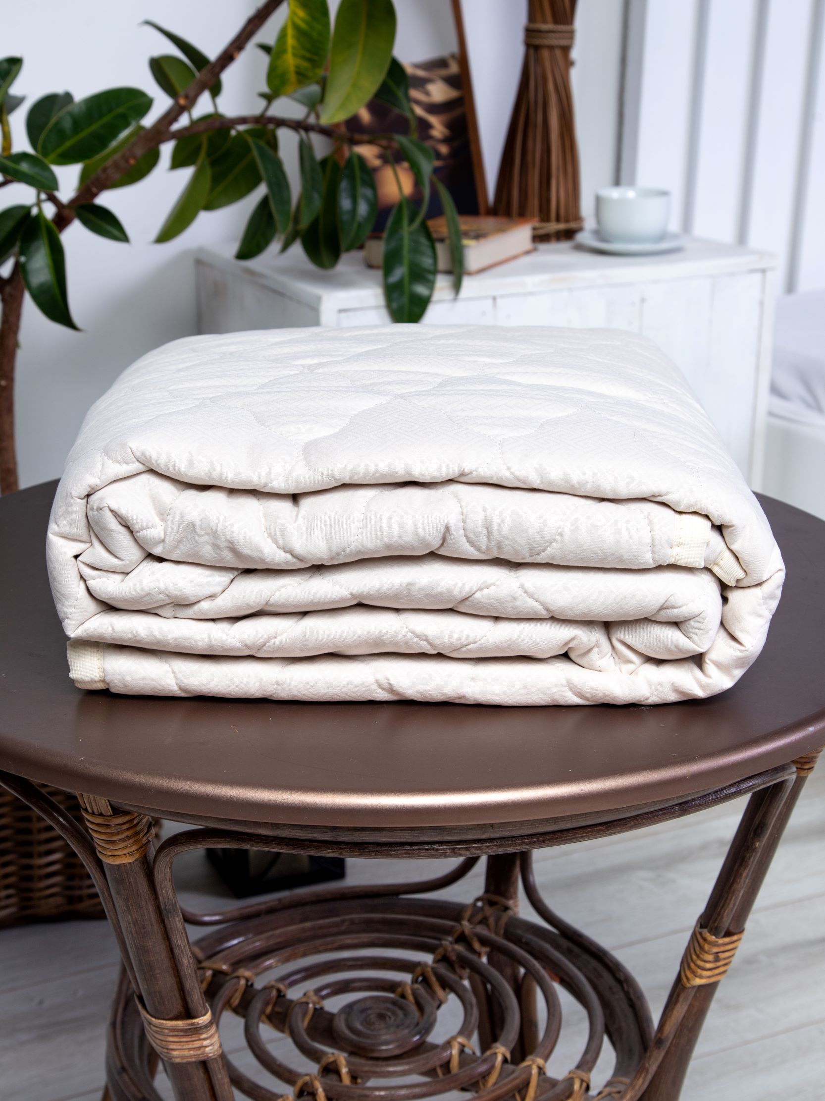 Наматрасник с наполнением из овечьей шерсти плотностью 150 гр/кв.м., окантован широкой тесьмой, по углам - резинка для фиксации на матрасе. Многоигольная стежка исключает смещение наполнителя внутри изделия, чехол устойчив к механическим воздействиям. Упаковка - тубус ПВХ с ручкой.