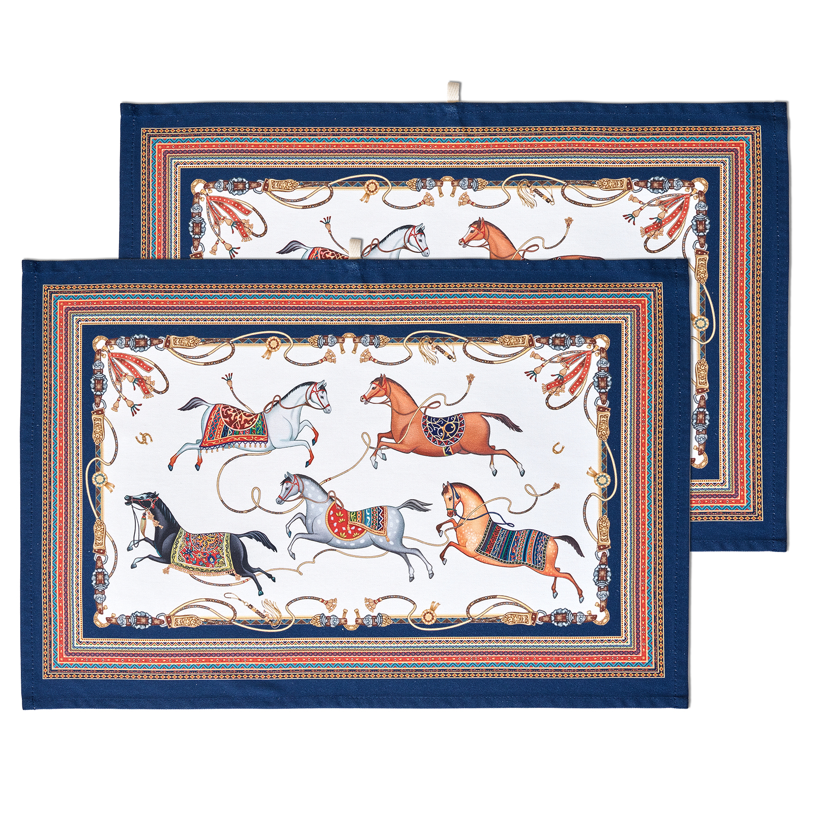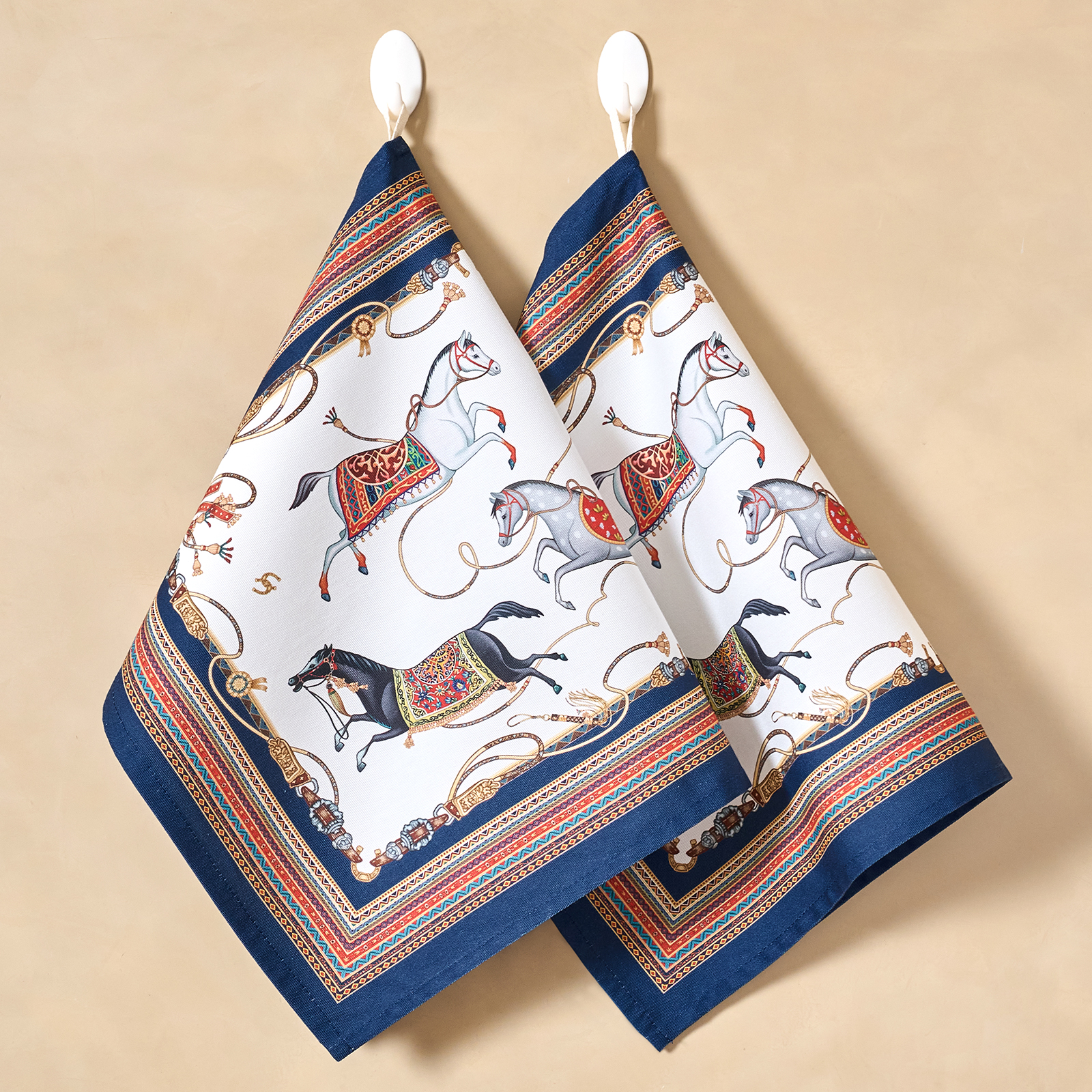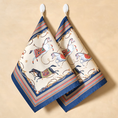 Белый фон украшен изящным орнаментом с лошадьми — символом 2026 года. Авторский принт, созданный художниками Lefard, нанесён методом цифровой печати, благодаря чему цвета остаются яркими даже после многократных стирок. Такой декоративный узор превращает полотенца в выразительный элемент сервировки или стильный акцент интерьера.