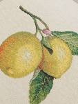 Рисунок создается переплетением нитей различных цветов и фактуры. Состав ткани: хлопок ( дающий фактуру и приятную тактильность ) и синтетические нити ( придающие износостойкость ). Плотность гобелена 410 г на кв.метр.