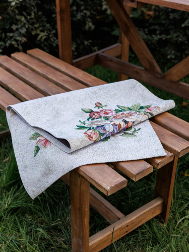 Рисунок создается переплетением нитей различных цветов и фактуры. Состав ткани: хлопок ( дающий фактуру и приятную тактильность ) и синтетические нити ( придающие износостойкость ). Плотность гобелена 410 г на кв.метр.