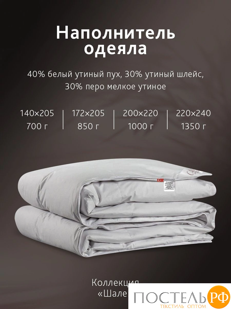 Состав наполнителя: 40% белый утиный пух, 30% утиный шлейс, 30% перо мелкое утиное