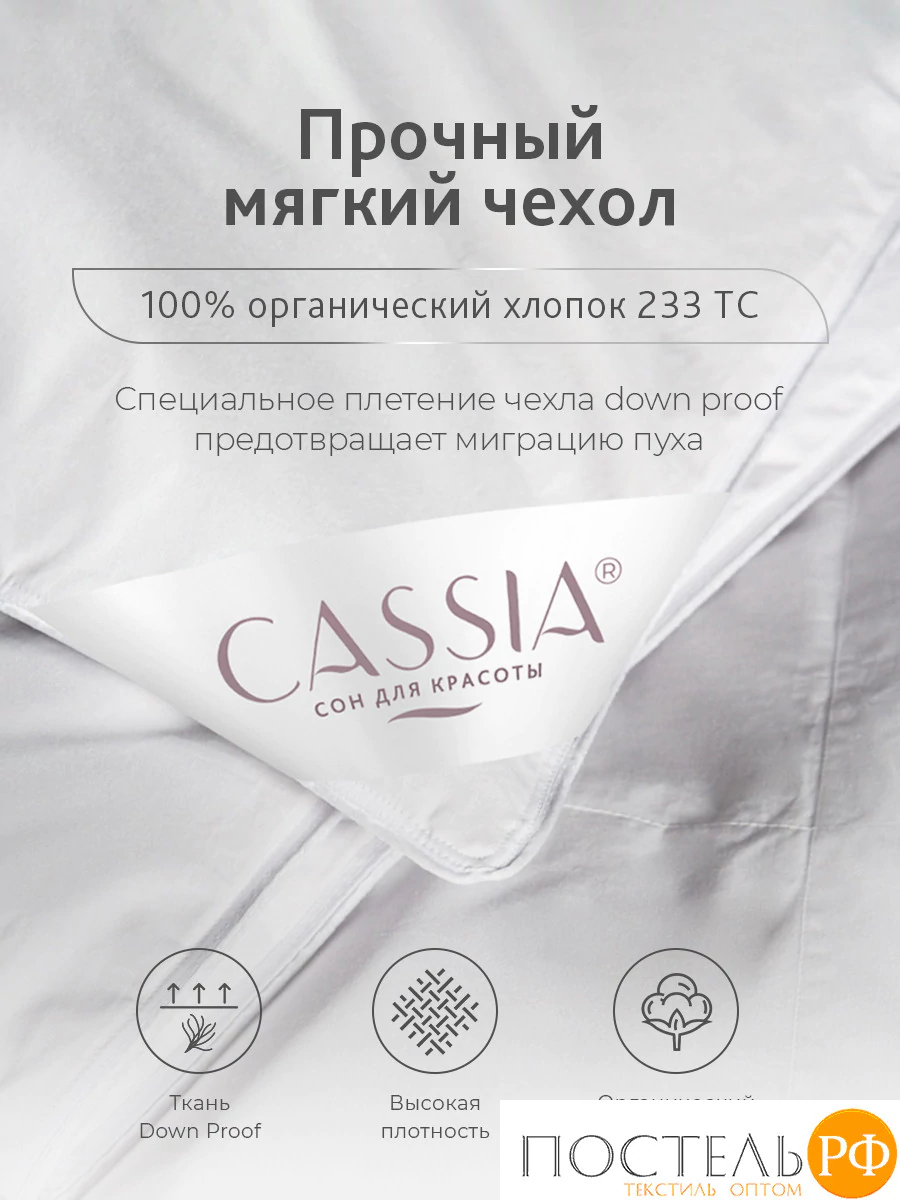 Чехол из 100% органического хлопка-тика Biodynamic Cotton 233 ТС мягкий, гипоаллергенный и экологичный. Специальное плетение ткани чехла Down Proof предотвращает миграцию пуха. Декоративный кант придает одеялу элегантный вид и увеличивает его прочность, а фигурная стежка обеспечивает равномерное распределение наполнителя, надежно удерживает пух и не дает ему деформироваться.