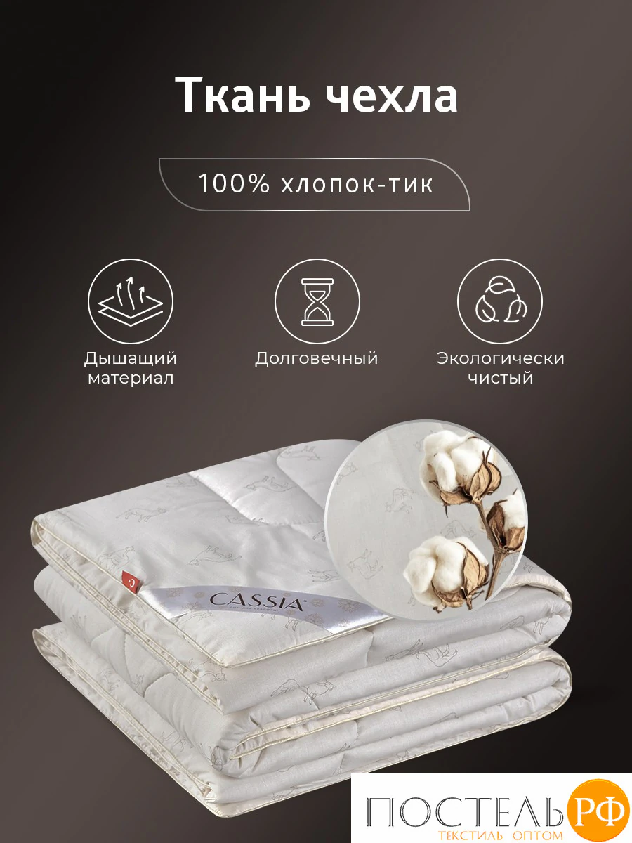 Чехол из 100% хлопка-тика — плотный, прочный и полностью натуральный, он надёжно удерживает наполнитель и обеспечивает комфортный, гипоаллергенный сон. Оригинальный кант придает одеялу элегантный вид и увеличивает его прочность, а фигурная стежка обеспечивает равномерное распределение наполнителя.