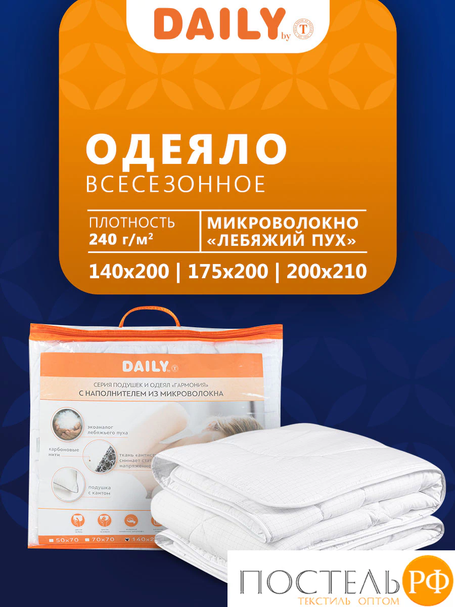 Всесезонное стеганое одеяло Гармония от бренда DAILY by T - ваш ключ к уюту в любое время года. Чехол одеяла выполнен из 100% микрофибры с карбоновой нитью, а наполнитель 100% микроволокно Лебяжий пух Ultra Soft с плотностью 240 г/м2.