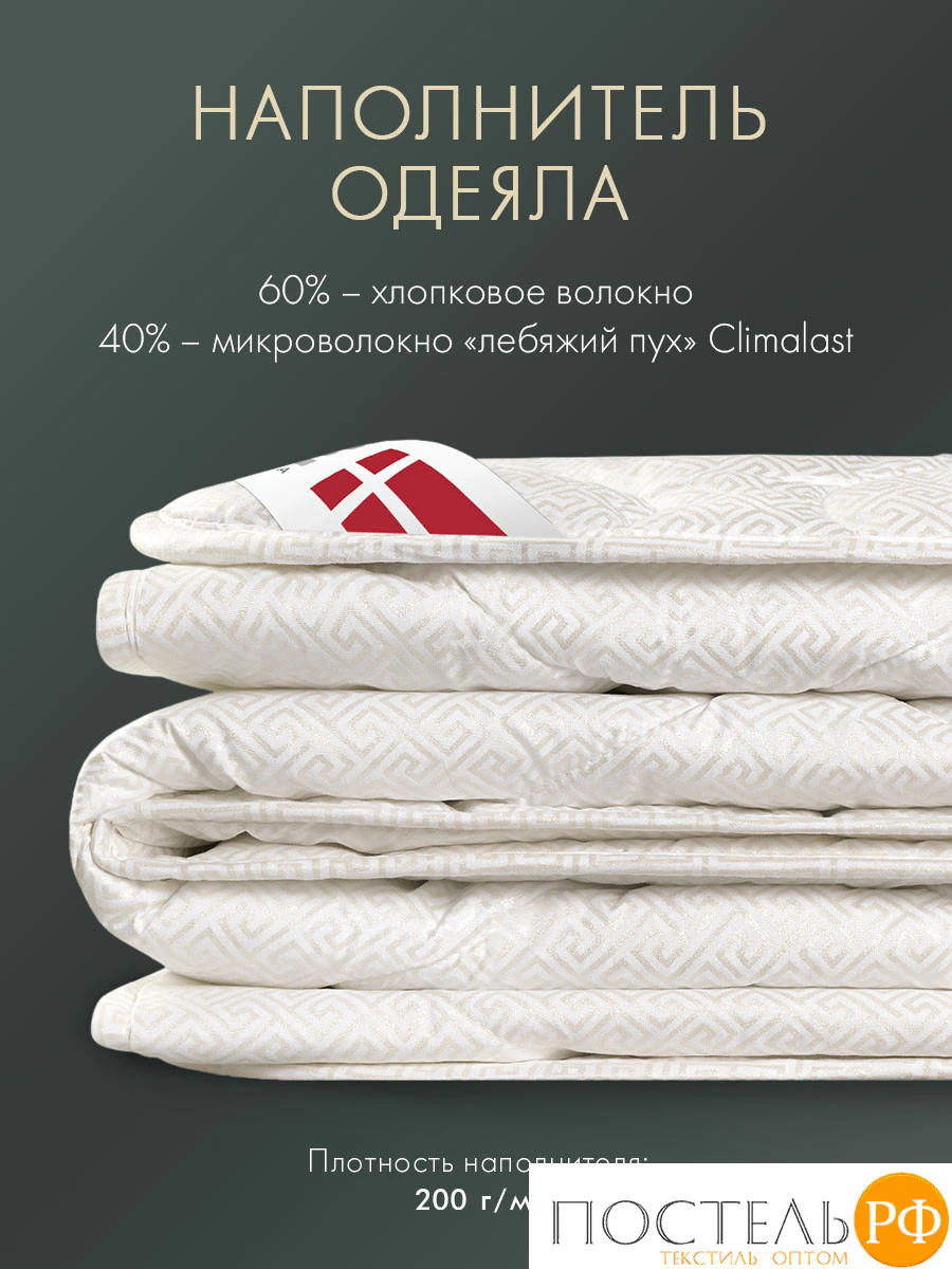 Стеганое одеяло коллекции «ДЕМЕТРА» двухспальное размером 175*200 см имеет чехол из 50% хлопка, 50% полиэстера; наполнитель из 60% хлопковое волокно, 40% микроволокно Climalast, плотностью 200 г/м2. Экологически чистый и теплый хлопковый наполнитель обеспечивает отличную воздухопроницаемость, способен впитывать излишки влаги, оставаясь при этом сухим и тактильно приятным придавая изделиям легкий и пышный вид благодаря своей пористой структуре. Микроволокно Climalast представляет собой силиконизированное микроволокно которое обладает всеми свойствами натурального пуха и является прочным и износостойким. Изделия гипоаллергенные и не имеют посторонних запахов. Такой наполнитель подходит людям с чувствительной и тонкой кожей. Чехол из плотной смесовой ткани не пропускает частички наполнителя на поверхность изделия. Одеяло обрамляет красивый кант в тон ткани.