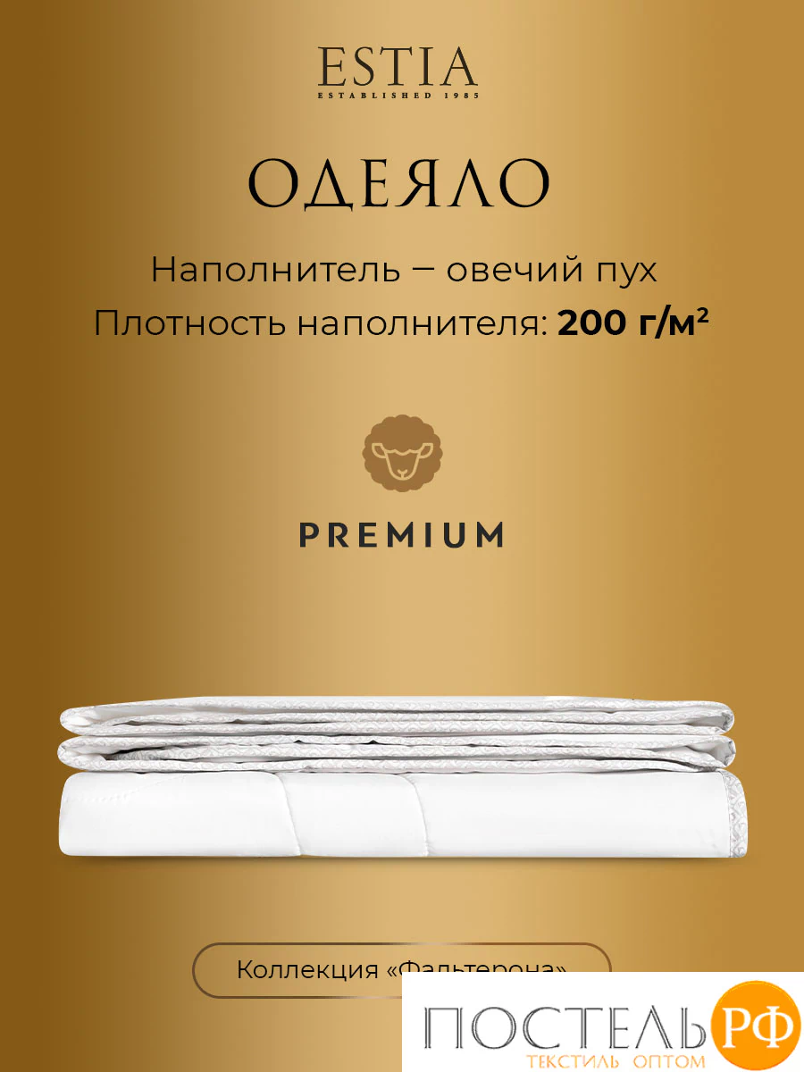 Лёгкое стеганое одеяло Фальтерона от бренда ESTIA — это идеальный выбор для теплого и комфортного сна. Чехол из нежной смесовой ткани обеспечивает мягкость, гигиеничность и долговечность, а наполнитель из 70% овечьего пуха и 30% полиэфирного волокна плотностью 200 г/м2 гарантирует тепло, комфорт и незабываемое ощущение уюта.