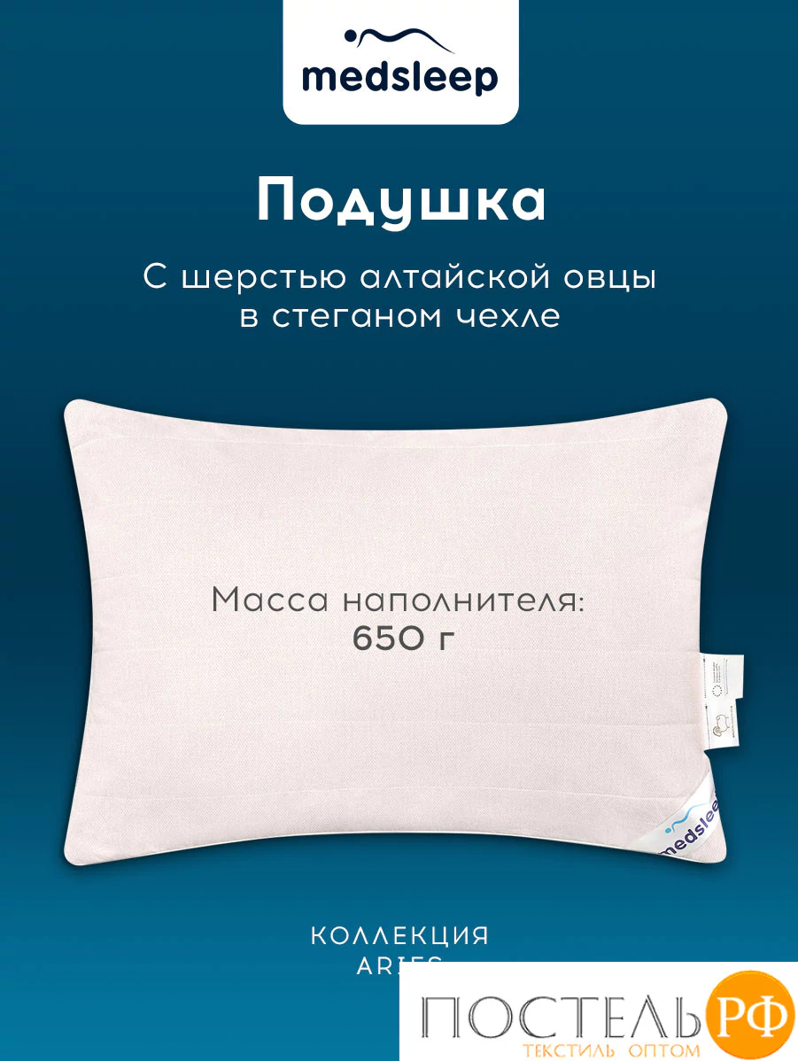 Шерстяная подушка стеганая коллекции «Aries» в размере 70*70 имеет чехол из 100% хлопка-тик, наполнитель чехла 70% шерсть алтайской овцы и 30% микроволокно, наполнитель ядра 100% полиэфирное волокно. Масса наполнителя: 850гр.