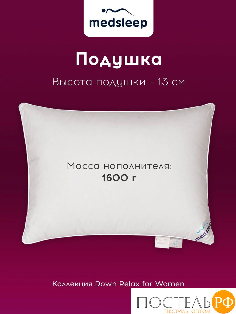 MedSleep Down Relax for Women подушка 70х70, 1пр., 2000 гр.,хлопок-тик/пух/пух-перо
