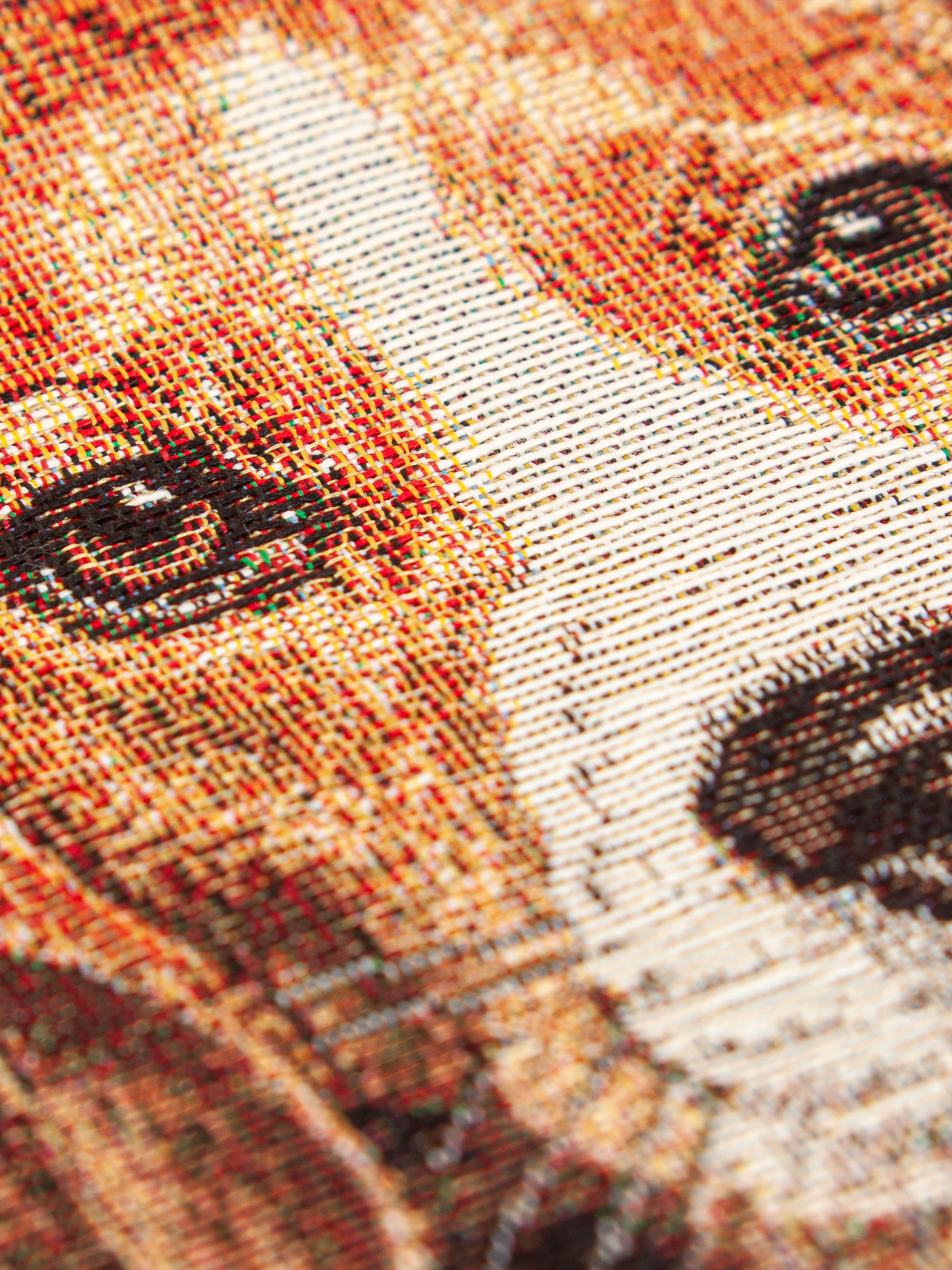 Рисунок создается переплетением нитей различных цветов и фактуры. Состав ткани: хлопок ( дающий фактуру и приятную тактильность ) и синтетические нити ( придающие износостойкость ). Плотность гобелена 410 г на кв.метр.