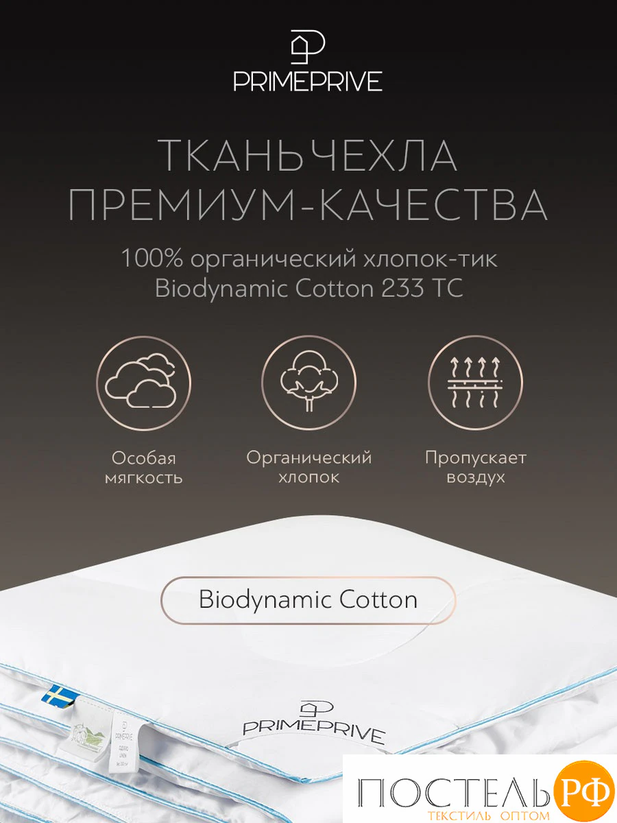Чехол из 100% органического хлопка-тика Biodynamic Cotton 233 ТС мягкий, гипоаллергенный и экологичный. Декоративный кант придает одеялу элегантный вид и увеличивает его прочность, а анатомическая стежка обеспечивает равномерное распределение наполнителя.