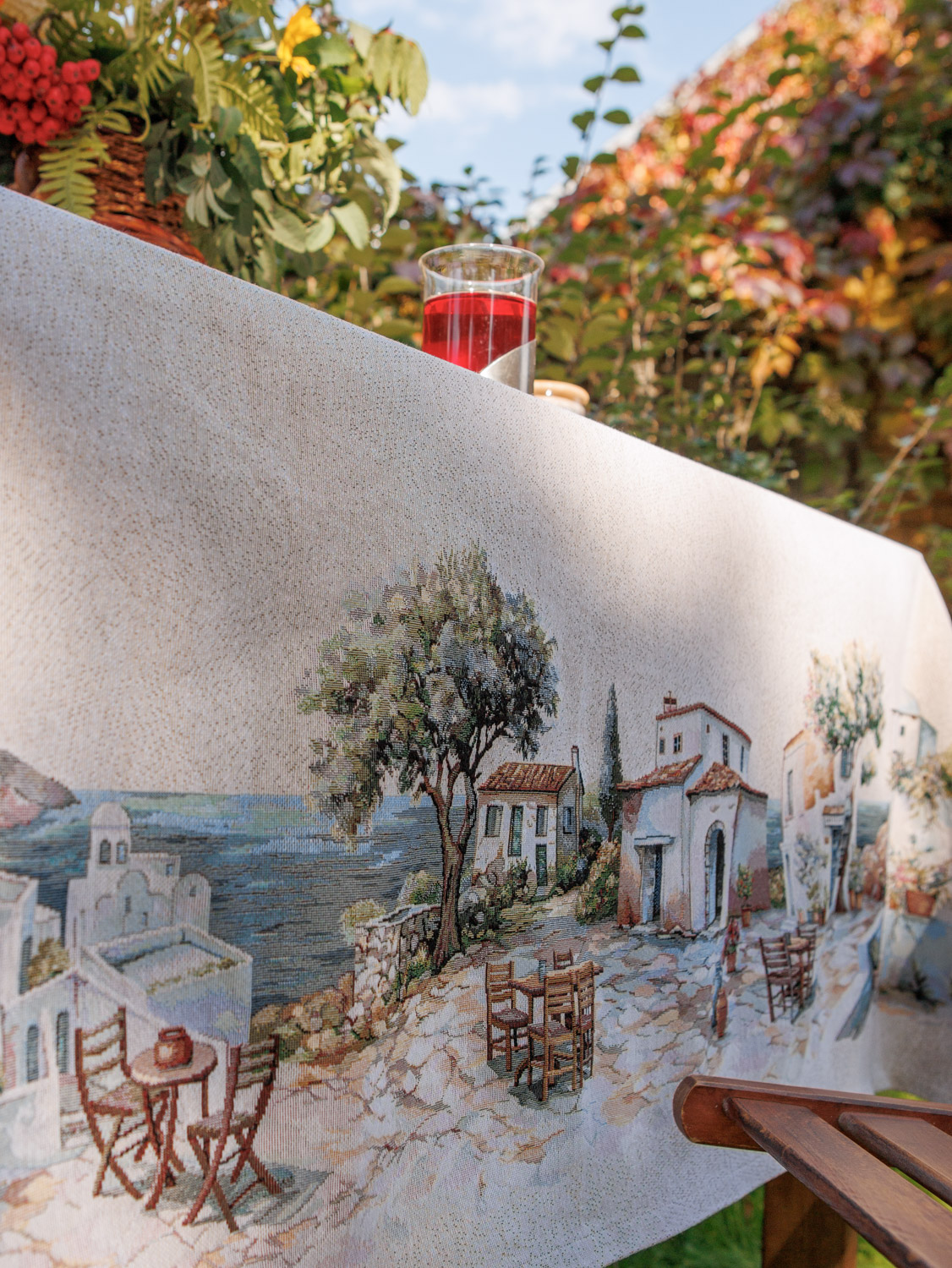 Рисунок создается переплетением нитей различных цветов и фактуры. Состав ткани: хлопок ( дающий фактуру и приятную тактильность ) и синтетические нити ( придающие износостойкость ). Плотность гобелена 410 г на кв.метр.