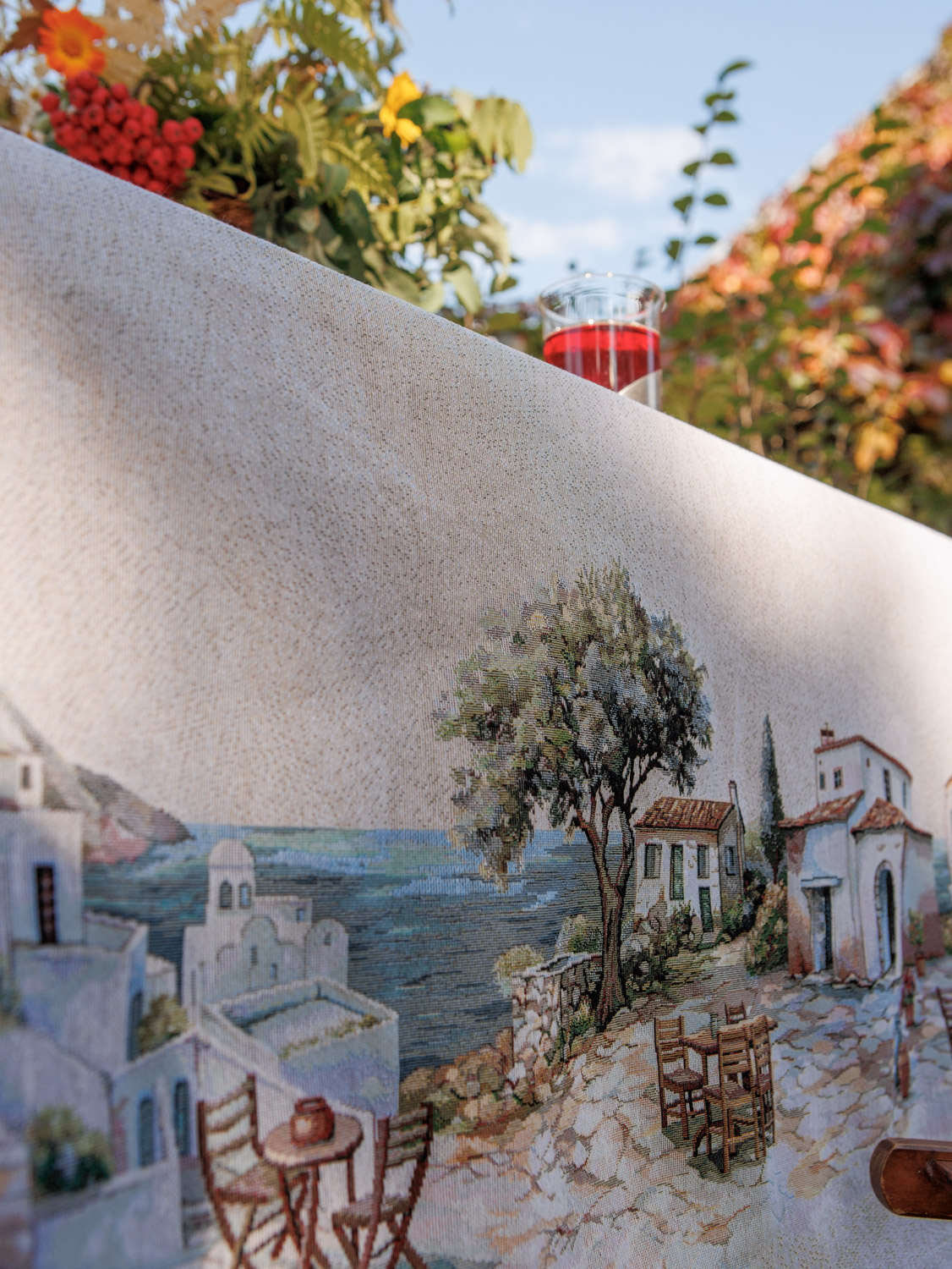 Рисунок создается переплетением нитей различных цветов и фактуры. Состав ткани: хлопок ( дающий фактуру и приятную тактильность ) и синтетические нити ( придающие износостойкость ). Плотность гобелена 410 г на кв.метр.