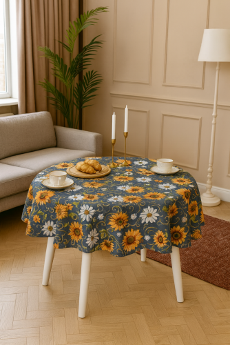 Подсолнухи и ромашки синий фон Скатерть круг д230 см 2519581