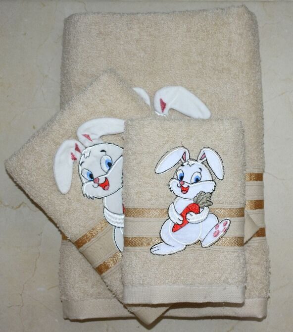 Махровое полотенце "Зайка с морковкой"- БЕЖЕВЫЙ 70*140 см. хлопок 100%