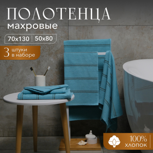 Вид ткани полотенецМахровое Тематика полотенецОднотонные Упаковка полотенецпакет Количество предметов в наборе3 полотенца в наборе Размер полотенец50*80-2шт+70*130