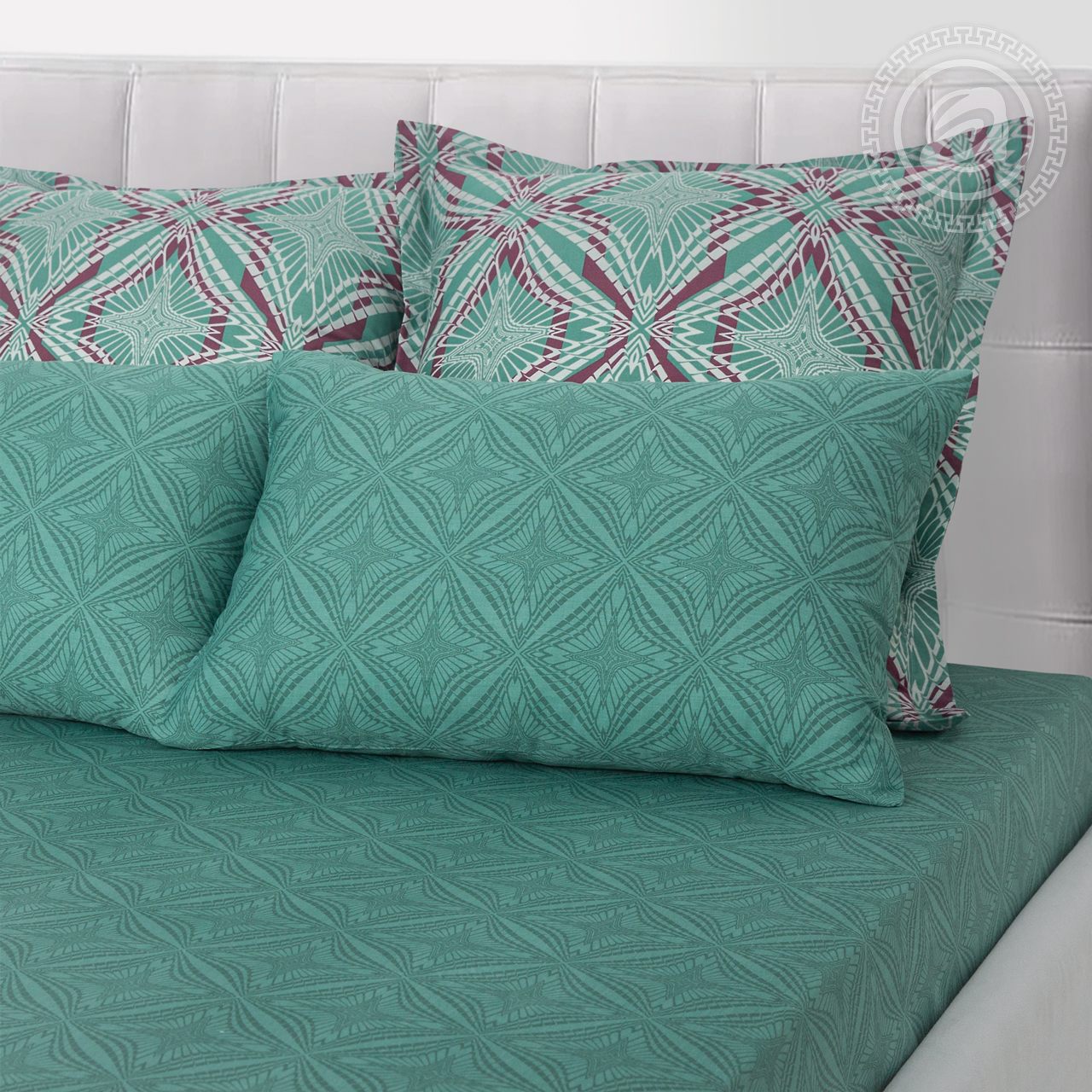 На комплекте «Джон», выполненном из мягкой и гладкой премиальной ткани «сатин», представлен геометрический рисунок в виде ромбов. Общая композиция выполнена в оттенках зеленого цвета и дополнена акцентными линиями. Авторский рисунок завораживает и добавляет в окружение утонченные и элегантные нотки.
