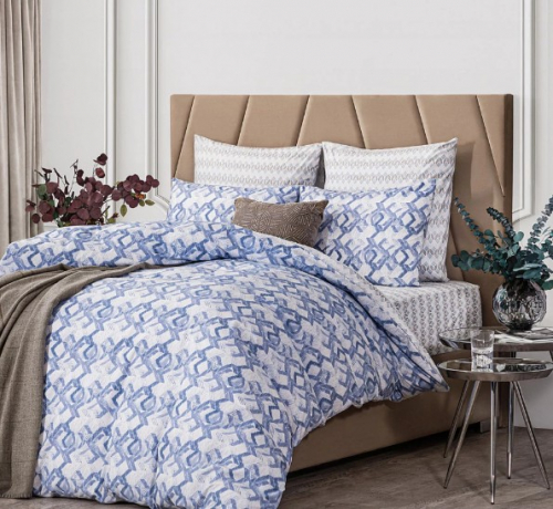 Постельное белье выполнено в нежных пастельных тонах, гармонично сочетающих светло-голубой и кремовый оттенки. Уникальный геометрический дизайн добавляет современности и стиля, идеально вписываясь в минималистичный или скандинавский интерьер. Мягкая и дышащая ткань обеспечит комфортный сон, а стильный внешний вид станет изюминкой вашей спальни. Комплект подходит как для классических, так и для современных интерьеров, создавая атмосферу уюта и роскоши.