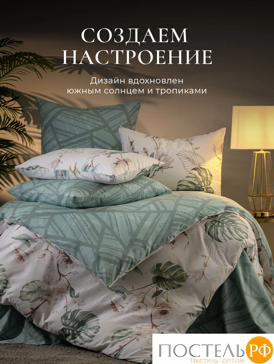Постельное белье Тропикана очаровывает своим ярким и свежим дизайном. Комплект выполнен в нежных пастельных тонах, с преобладанием белого фона, на котором изображены экзотические растения и цветы. Яркие листья монстеры и утонченные цветы в оттенках розового и зелёного создают атмосферу тропического рая. Ткань-компаньон в мягком бирюзовом цвете с геометрическим узором отлично дополняет общий вид, придавая комплекту современный и стильный акцент. Такой дизайн идеально вписывается в интерьеры в тропическом или экостиле, добавляя в ваше пространство уют и свежесть. Постельное белье ESTIA станет ярким акцентом в вашей спальне и обеспечит комфортный сон.