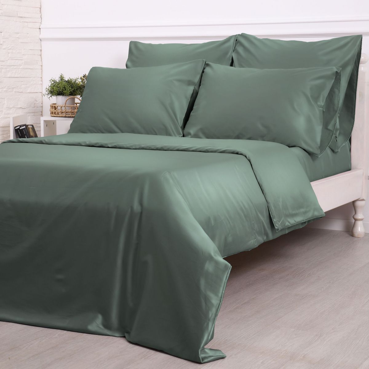 Состав ткани — 100% хлопок, а плотность материала составляет 142 г/м², что обеспечивает долговечность и прочность. Спокойный серо-зеленый цвет добавит уюта и элегантности в интерьер, а мягкость сатина подарит вам незабываемые сны.